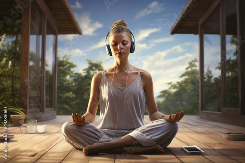 A young girl meditates on an open terrace on a mat in headphones, against the backdrop of nature, yoga pose, lifestyle, relaxation and meditation