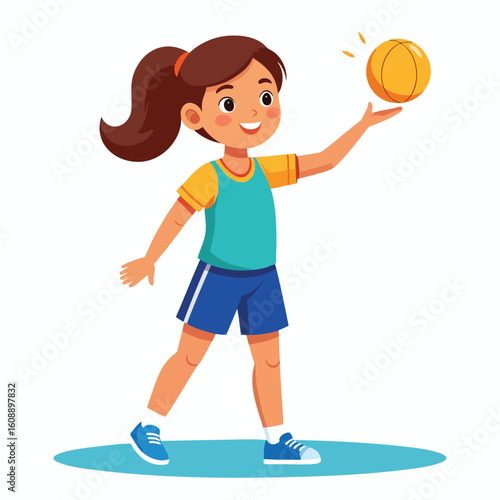 A young girl with a ponytail balances a yellow basketball on her outstretched hand, smiling.