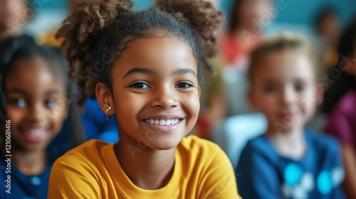 A young girl with curly hair beams with a joyful smile in a vibrant classroom filled with other happy children. The atmosphere is filled with excitement and positivity.