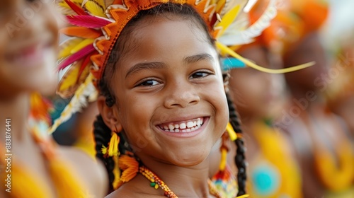 A young girl with two braids and a beautiful feathered headdress beams with joy, surrounded by other children in colorful cultural attire during a lively festival.