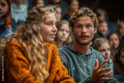 A young man actively engages with his audience during a public speaking event.
