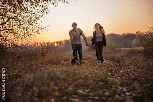 A young man and a girl are walking in the autumn forest next to the lake. Couple in love spend time forever together. Traveling during the cold season, on weekend days. Happy lovers hold hands, kiss