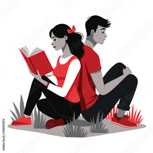 A young man and a young woman sit together outdoors, reading a book. The woman is holding the book open, while the man looks on. Generative AI