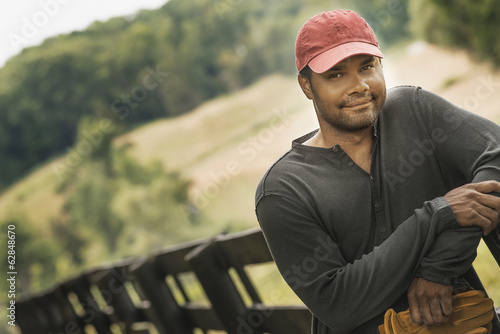 A young man with a baseball cap standing on a walkway with a rural background.