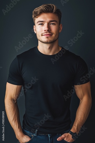 A young man with a muscular build stands confidently against a dark background. He has short, styled hair and is wearing a fitted black t-shirt mockup and jeans, with a relaxed posture.