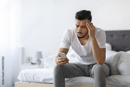 A young Middle Eastern man sits on a bed in his bedroom, looking worried as he reads an unpleasant message on his smartphone. He touches his head, feeling anxious about the news.