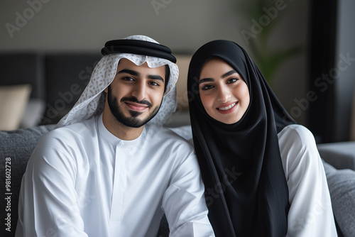 A young smiling Emirati couple sitting on gray sofa, radiating happiness and warmth in cozy living space. Their traditional attire reflects cultural pride and modern elegance
