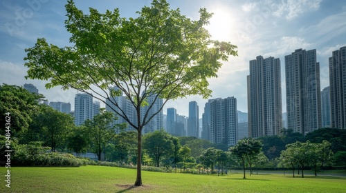 A young tree thriving in an urban park, with skyscrapers in the distance blending nature and modernity.