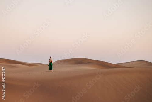 A young woman in a long green dress stands in the middle of sand dunes