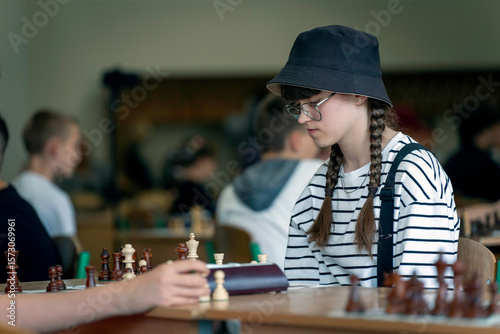 A young woman in glasses concentrates on a move while playing chess. A girl plays in a chess tournament. Girl at the chessboard. Tournament, portrait of teenage girl playing chess