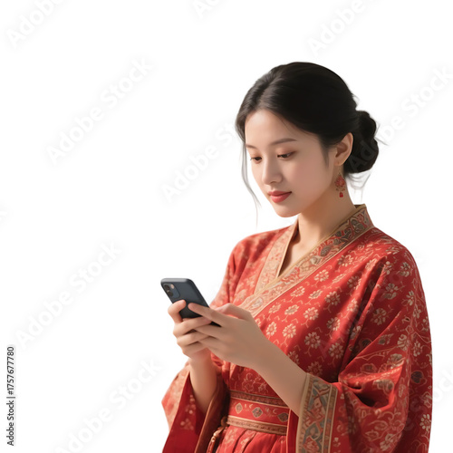A young woman in traditional red attire is using a smartphone, combining traditional and modern elements.