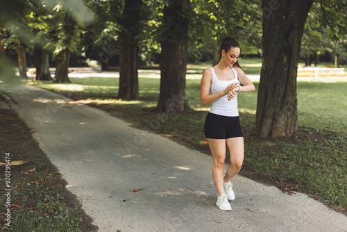 A young woman jogging in a park, checking her smartwatch. She wears a white tank top and black shorts, with a natural green background of trees and grass.