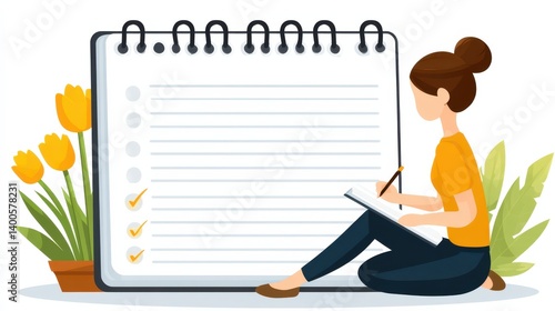 A young woman sits beside a large notepad, writing notes, with vibrant flowers in view, symbolizing creativity and organization.