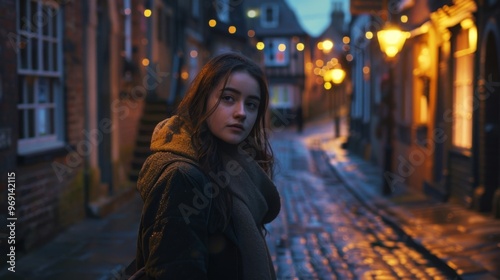 A young woman stands in a charming evening street, illuminated by warm lights. The cobblestones reflect a calm, serene atmosphere.