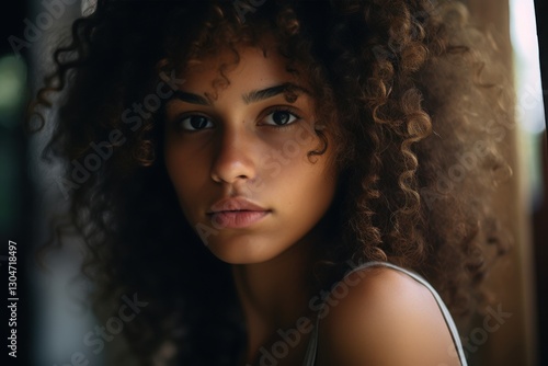 A young woman with beautiful, voluminous curls gazes directly at the viewer, her thoughtful expression capturing a moment of introspection and serenity in a softly lit environment