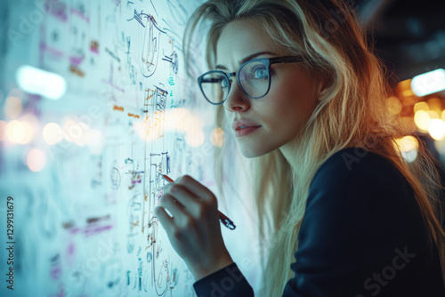 A young woman with glasses intently works on a complex whiteboard design, showcasing focused creativity and problem-solving.