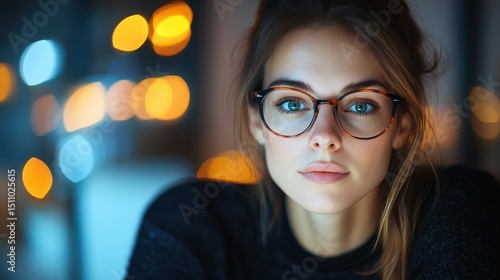 A young woman with glasses looks directly at the camera, reflecting confidence and insight, surrounded by softly blurred city lights in the background.