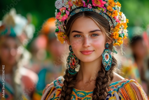 A young woman with long light brown hair braided into two plaits. She wears brightly colored traditional clothing with embroidery and patterns. A multicolored floral wreath is on her head, and she has