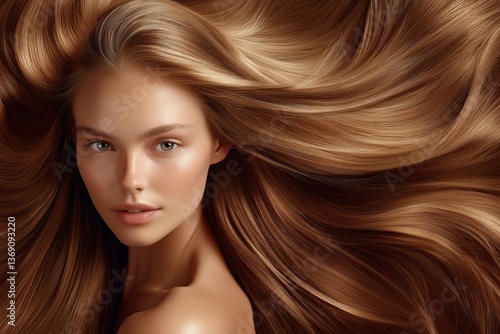 A young woman with long, voluminous, silky golden-brown hair poses gracefully with a glowing complexion