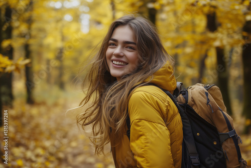 A young woman with long, wavy hair laughing joyfully while walking through a forest with golden autumn leaves, wearing a yellow jacket and a backpack
