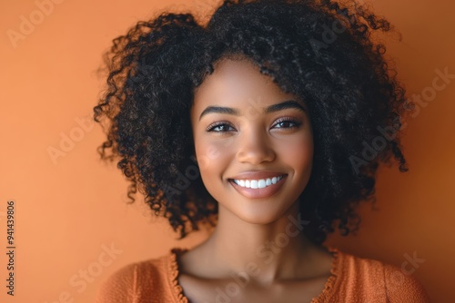 a young woman with natural curly hair, smiling confidently against various pastel backgrounds. These images are ideal for content focused on beauty, diversity, and modern fashion.