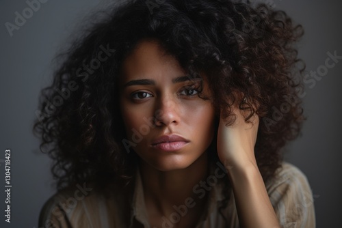 A young woman with striking curly hair gazes thoughtfully into the distance, her hand gently brushing through her hair. The soft lighting accentuates her contemplative mood in a serene atmosphere