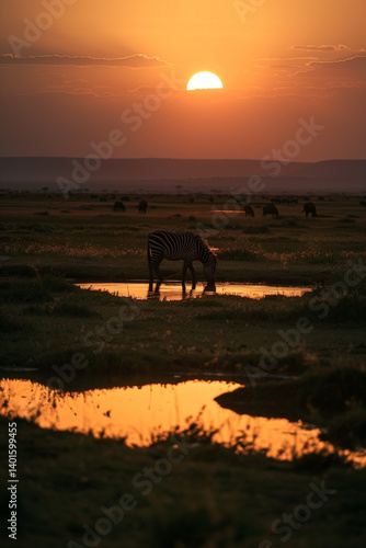 A zebra quenches its thirst in a savanna watering hole as the sun sets, painting the landscape in fiery hues. A picturesque scene capturing the serenity of the natural world.