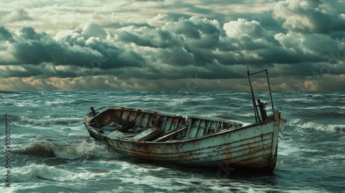 Abandoned Boat in Stormy Sea.