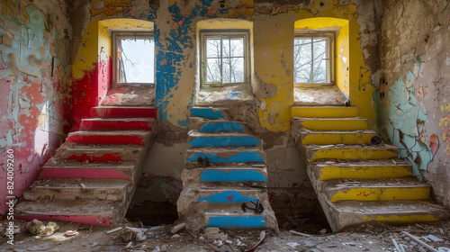 Abandoned building with vibrant red, blue, and yellow staircases