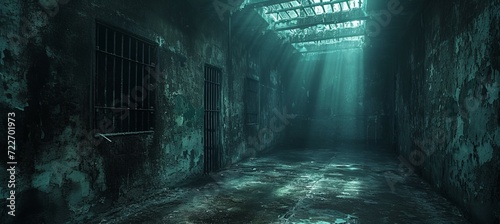 Abandoned prison hallway. Dark melancholic scene. Generative AI technology.