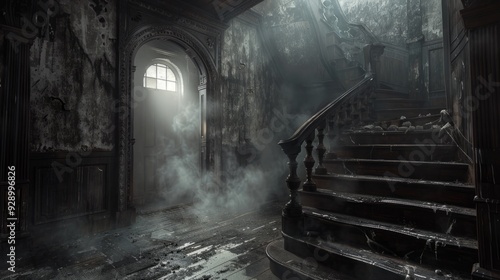 Abandoned staircase in a decaying mansion surrounded by mist and deteriorating walls