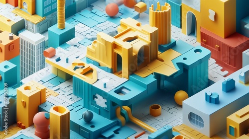 Abstract 3D city made of colorful geometric shapes.