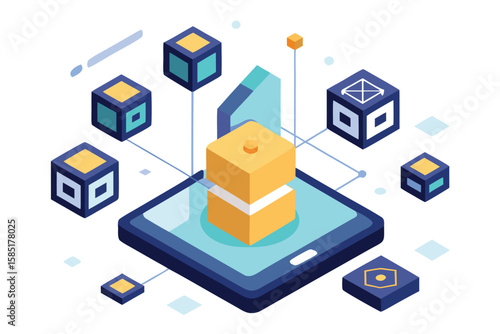 Abstract 3d illustration featuring data representation and cloud computing elements on a tablet