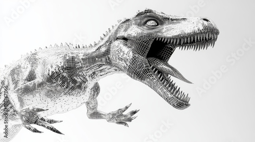 Abstract 3d velociraptor with open mouth isolated in white background. Hand drawing of small fast dinosaur with claws consists of connected dots. Vector animal sketch concept. Low poly wireframe