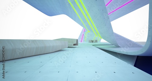 Abstract architectural concrete and wood interior of a modern villa on the sea with colored neon lighting. 3D illustration and rendering.