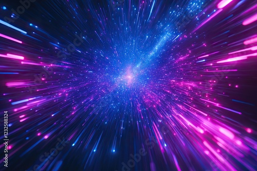 Abstract background in blue and purple neon glow colors on black. Speed of light in the galaxy