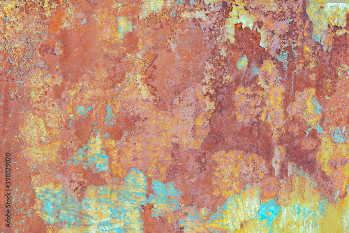 Abstract background, old rusty metal surface with peeling paint.