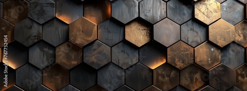 Abstract background with dark gray and orange hexagon shapes, creating an industrial atmosphere. The wall is made of dark metal, glowing in golden light. Background for design, banner, poster or cover
