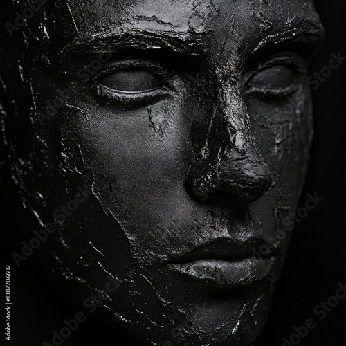 Abstract black sculpted face with cracked texture and shadow play