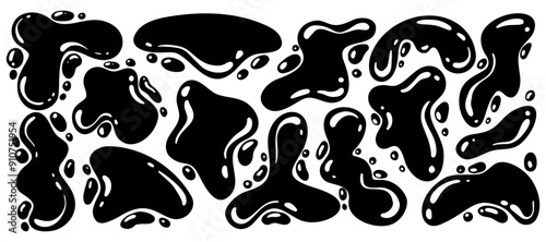 Abstract blob shapes. Organic liquid random wavy forms. Irregular fluid black spots and bubbles. Vector glossy elements. Trendy drops silhouettes. Modern Y2K swirl amoeba splotch.