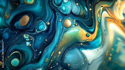 Abstract Blue and Gold Swirling Liquid Acrylic Paint Background