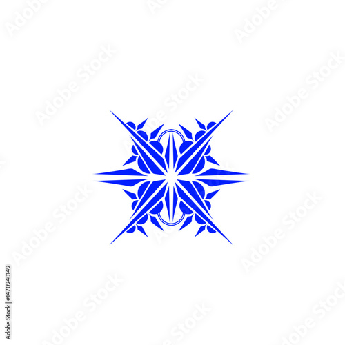 Abstract blue geometric design with sharp edges and floral elements on a white background