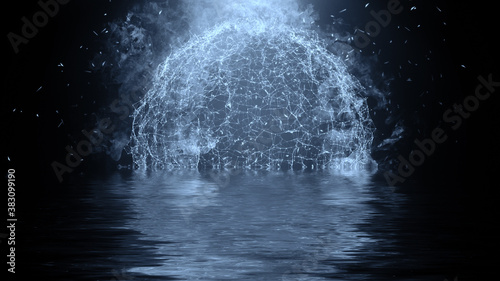 Abstract blurred blue plexus effect background. Fire planet earth with particles on reflection in water. Mess communication technology network background with moving lines and dots.Stock illustration.