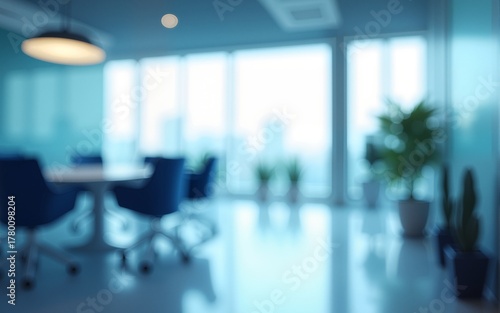Abstract Blurred Glass Office Interior with Light and Shadow, Modern Business Space, Blue 3D Render Illustration. High quality