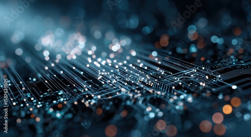 Abstract circuit board, glowing lines and points