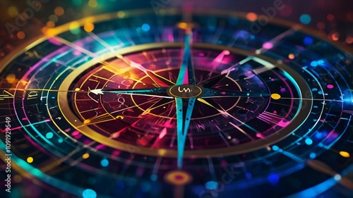 Abstract circular compass design with glowing lines and dots.