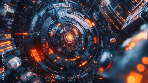 Abstract circular technological tunnel with glowing orange and blue lights.