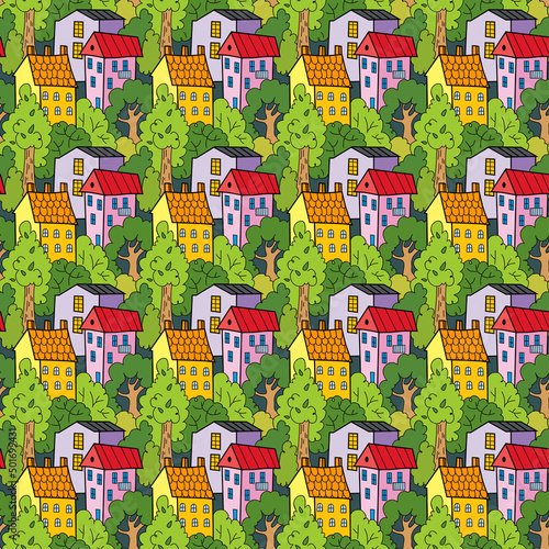 Abstract city with rooftops and trees. Vector seamless pattern. Cartoon style.