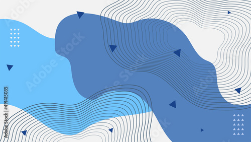 Abstract colorful blue Memphis flat geometric shapes background. Abstract composition with lines square dot triangle circle and wavy flat style. Design for poster, presentation, card, cover, banner.