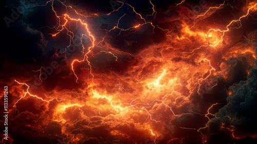 Abstract cosmic storm, swirling red, orange, and dark clouds with streaks of lightning, dramatic contrast between light and shadow, ultra-realistic depth